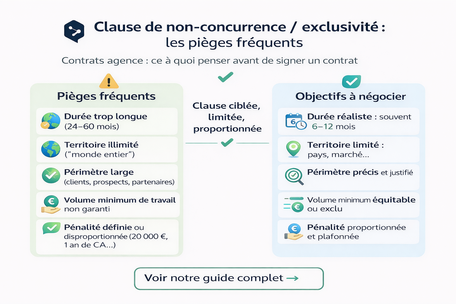 En pratique, beaucoup de contrats mélangent tout. Le risque est simple : vous pensez signer une restriction "logique", et vous vous retrouvez avec une interdiction très large, difficile à respecter, et potentiellement coûteuse si l'agence décide de l'appliquer.